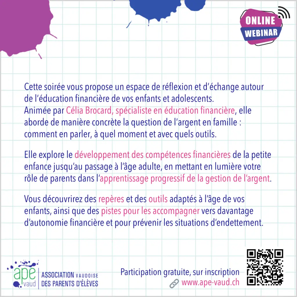 L’APE Vaud a le plaisir de vous proposer une nouvelle webconférence sur une thématique importante, qui n’est pas enseignée à l’école: la gestion de l’argent.